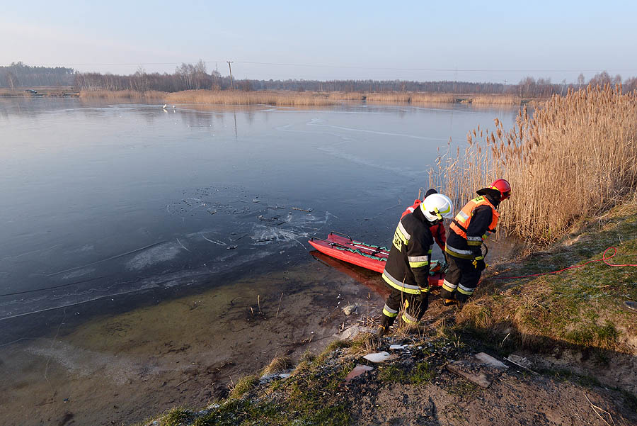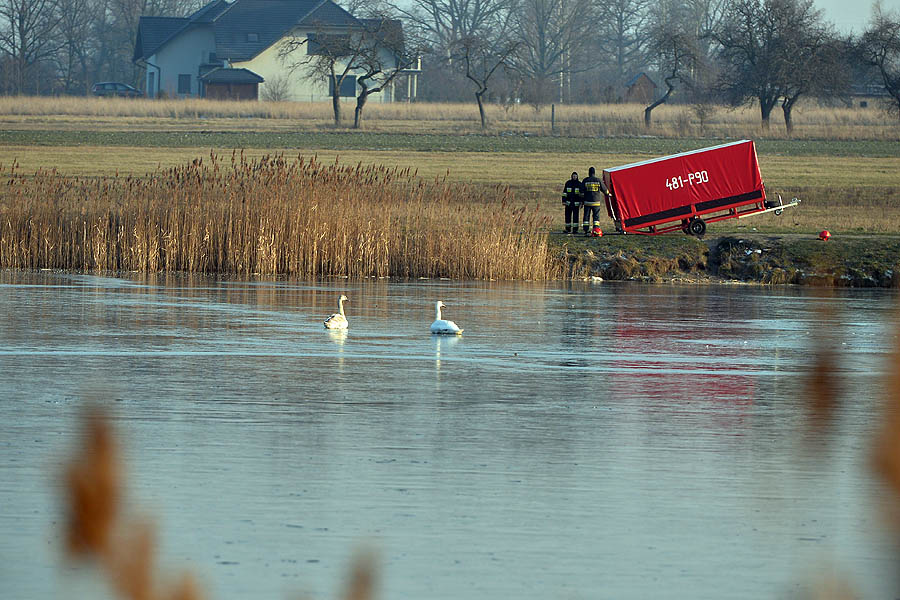 Ratownicy otrzymali zgłoszenie o dwóch łabędziach przymarzniętych do lodowej tafli zbiornika wodnego w Chechle. Na miejscu okazało się, że na lodzie, około 30 metrów od brzegu, znajdują się dwa ptaki.
