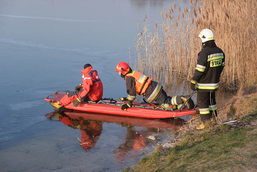 Strażacy wyposażeni w specjalistyczny sprzęt do ratownictwa lodowego pojechali do Chechła.