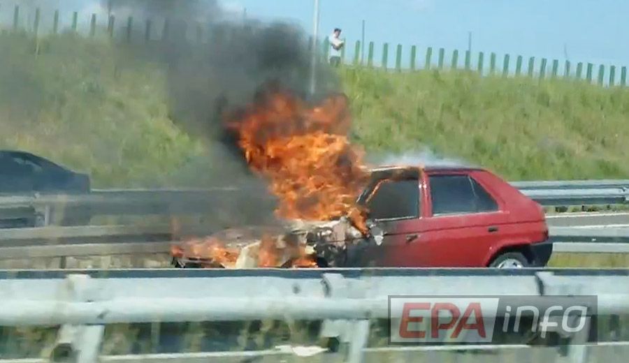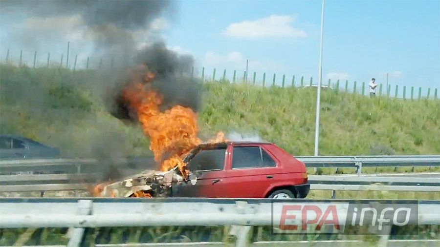 Na drodze ekspresowej S14 doszczętnie spłonęła Skoda Favorit. Przyczyną było zwarcie instalacji elektrycznej.