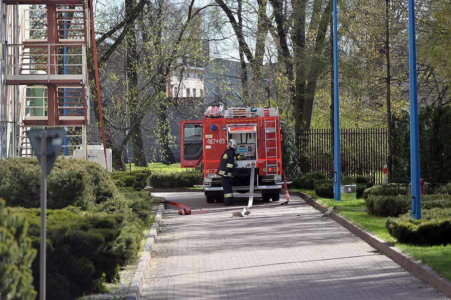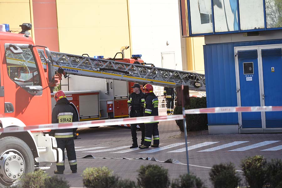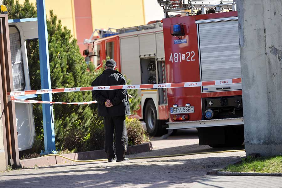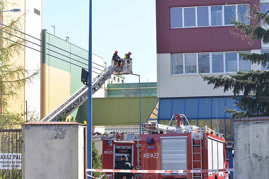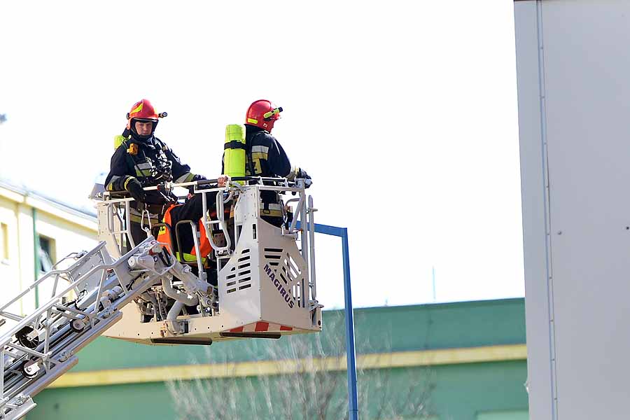 Strażacy musieli ewakuować jednego z pracowników, który przed ogniem skrył się na dachu budynku. Na szczęście były to tylko ćwiczenia.