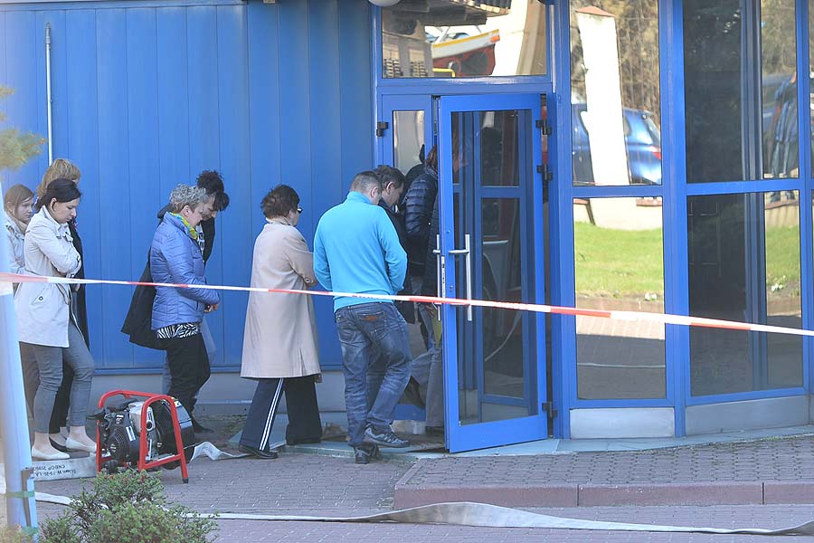 Zastępy JRG po przybyciu na miejsce zdarzenia, uzyskując informację o pożarze urządzenia odpylającego, podjęły działania gaśnicze wprowadzając dwa prądy wody, jeden po klatce schodowej na piętro techniczne bezpośrednio na pożar cyklonu oraz drugi po zewnętrznej klatce schodowej w obronie na piętro techniczne. W wyniku zadymienia pracownik z obsługi technicznej został podtruty dymem i ewakuował się po drabince na dach budynku. Przy użyciu drabiny SCD 37 ratownicy ewakuowali poszkodowanego.