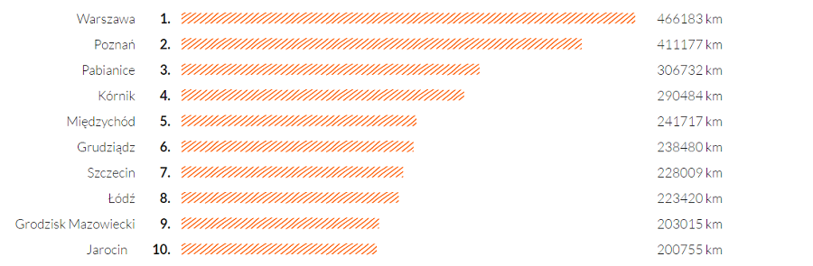 Oznacza to oczywiście, że do naszego miasta wkrótce dotrą stojaki rowerowe, ufundowane przez fundację All For Planet, zarządzaną przez Allegro. Aktywnym pabianiczanom udało się zdeklasować o wiele większe miasta takie jak Kraków, Szczecin i Łódź, tocząc o trzecią lokatę zaciekłą walkę z Kórnikiem, którego reprezentacja ostatecznie pozostała w tyle o ponad 16 tys. km. 30 września okazało się, że więcej od rowerzystów z Pabianic przejechali jedynie poznaniacy i warszawiacy.