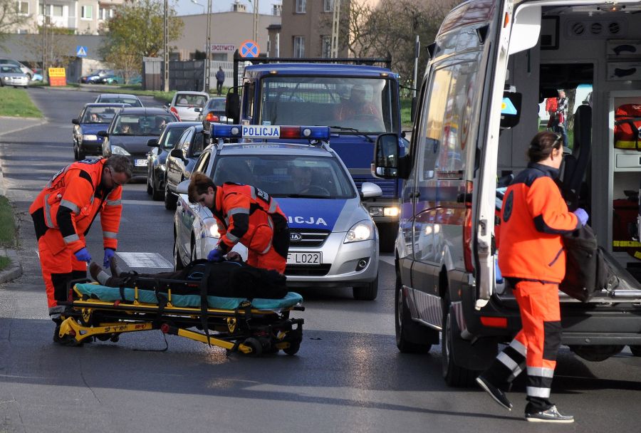 Rowerzystę na noszach prawdopodobnie z urazem nogi ratownicy z Falck zabrali na badania do szpitala. Okoliczności wypadku ustala pracująca na miejscu policja.