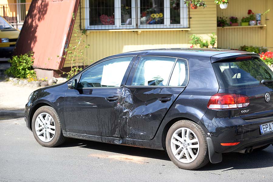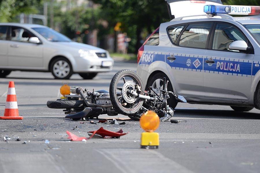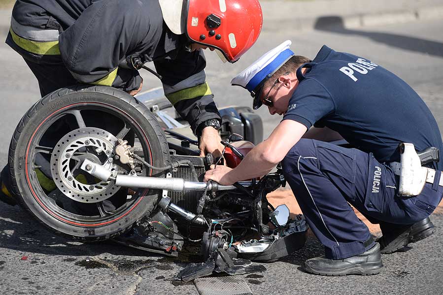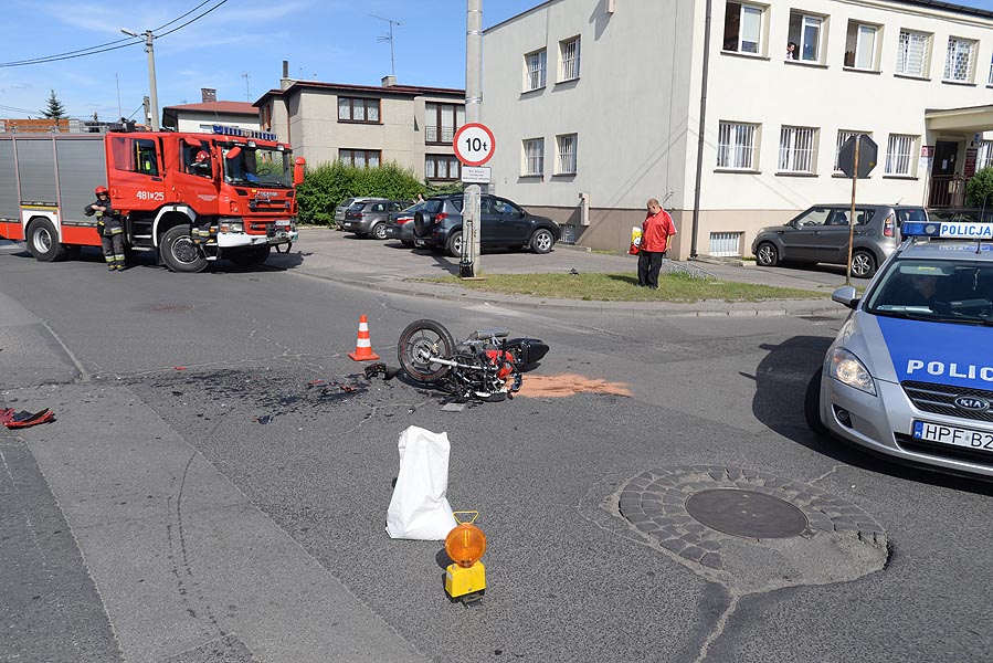 17-letni motocyklista jechał Hondą CBR 125 ul. Karniszewicką w stronę Wspólnej około godz. 15.30. Z ulicy Torowej (od Łaskiej) VW Golfem wyjechała młoda dziewczyna. Motocykl z dużą siłą uderzył w lewy bok auta, w którym otworzyły się boczne kurtyny. Na miejsce przyjechały dwie karetki. Jedna z nich zabrała motocyklistę do szpitala. Wjazd w ulicę Torową od Łaskiej jest zablokowany.