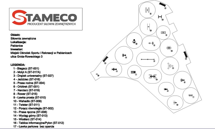 Zainstalowanych zostanie 15 urządzeń do ćwiczeń. Listę i rozmieszczenie można zobaczyć w galerii zdjęć. Publikujemy również fotografie z przykładowymi siłowniami zewnętrznymi wykonanymi przez firmę Stameco.