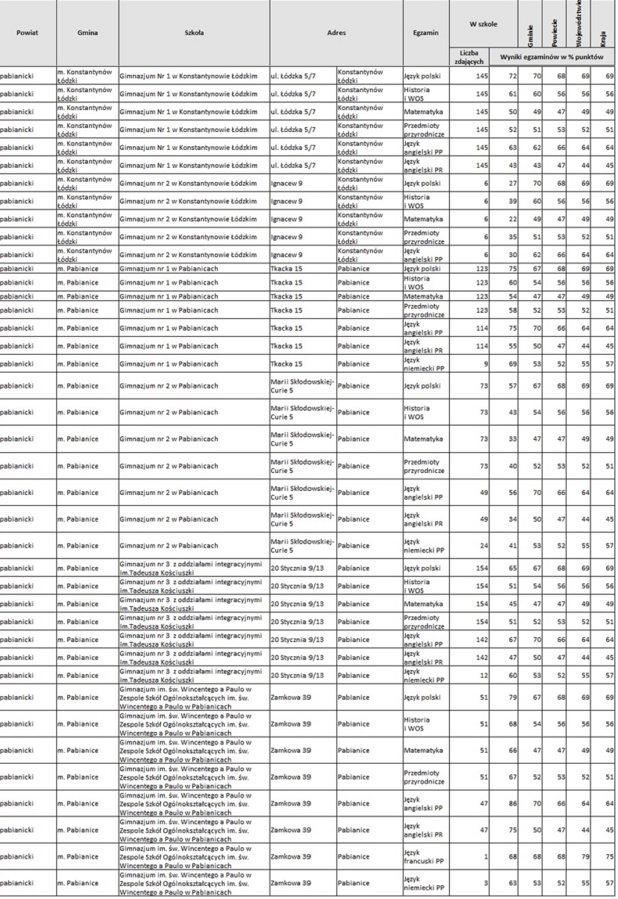 Wśród większych szkół (tych, w których liczba uczniów przekroczyła 100) najlepsze okazało się Gim. nr 1 w Pabianicach, ustępując Gim. nr 1 w Konstantynowie Łódzkim, jedynie na polu wiedzy z historii i wiedzy o społeczeństwie.