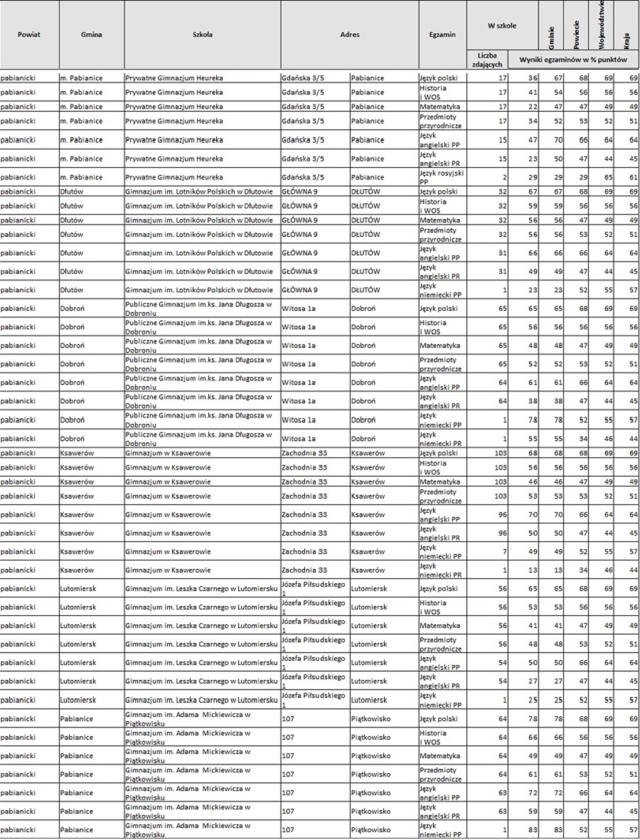 Według danych opublikowanych przez Okręgową Komisję Egzaminacyjną w Łodzi wyniki egzaminu gimnazjalnego są w większości przedmiotów słabsze niż w roku ubiegłym. W powiecie pabianickim, wśród szkół publicznych, bezsprzecznie króluje Gim. im. Adama Mickiewicza w Piątkowisku, ustępując pierwszego miejsca jedynie w matematyce, którą najlepiej napisali uczniowie Gim. im. Lotników Polskich w Dłutowie. Wynik szkoły z Piątkowiska stworzyło 64 uczniów, a dłutowskiej 32.