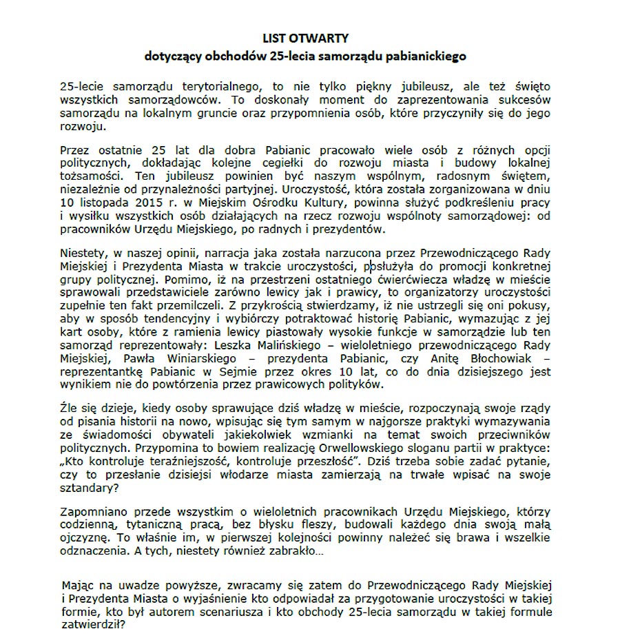 – Z przykrością stwierdzamy, iż nie ustrzegli się oni pokusy, aby w sposób tendencyjny i wybiórczy potraktować historię Pabianic, wymazując z jej kart osoby, które z ramienia lewicy piastowały wysokie funkcje w samorządzie lub ten samorząd reprezentowały: Leszka Malińskiego – wieloletniego przewodniczącego Rady Miejskiej, Pawła Winiarskiego – prezydenta Pabianic, czy Anitę Błochowiak – reprezentantkę Pabianic w Sejmie przez okres 10 lat, co do dnia dzisiejszego jest wynikiem nie do powtórzenia przez prawicowych polityków – piszą w liście.
