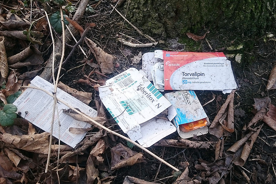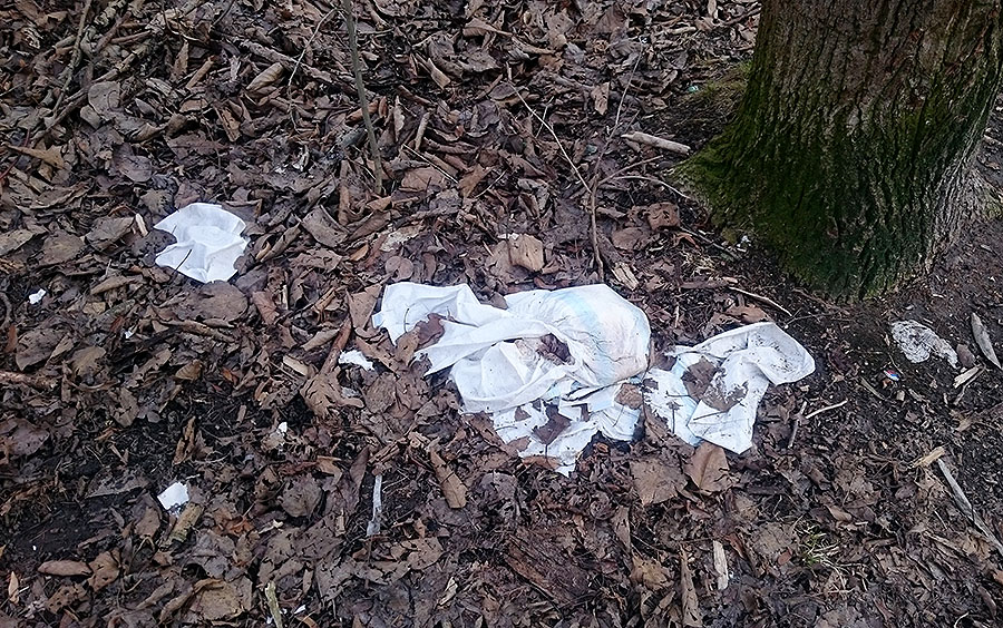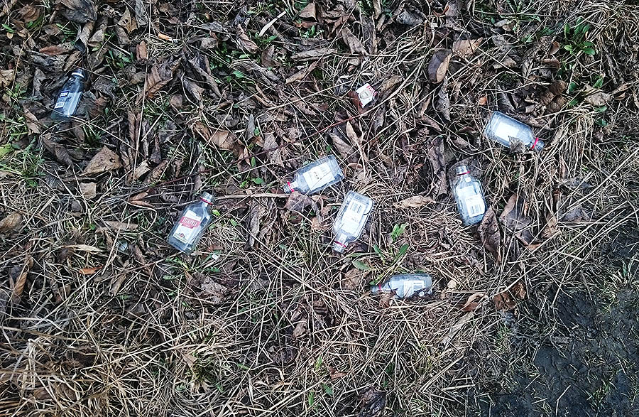 Puste butelki po wódce, piwach, stare leki, zużyte pieluchy to krajobraz lasku położonego na przy skrzyżowaniu ul. Siennej i Smugowej.