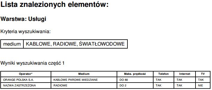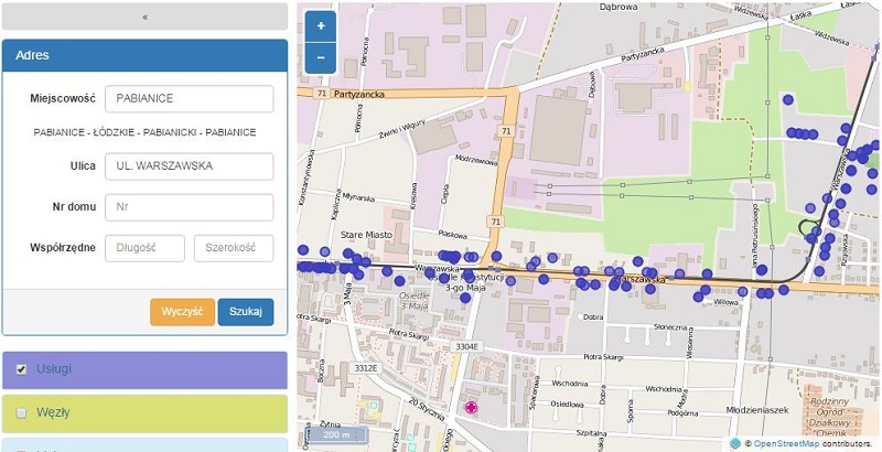 Po lewej stronie należy wpisać interesujący nas adres – miasto i ulicę (numer posesji nie jest wymagany). Następnie należy zaznaczyć „ptaszkiem” pole Usługi, a na końcu kliknąć przycisk Szukaj. Naraz można sprawdzić tylko jedną ulicę.