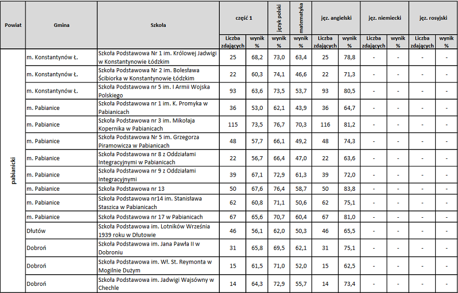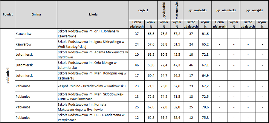 Średnie wyniki w skali powiatu pabianickiego: część I – 64,1% (w tym j. pol. – 71,5% i matematyka – 56,7%), cześć II – 75%
