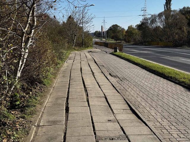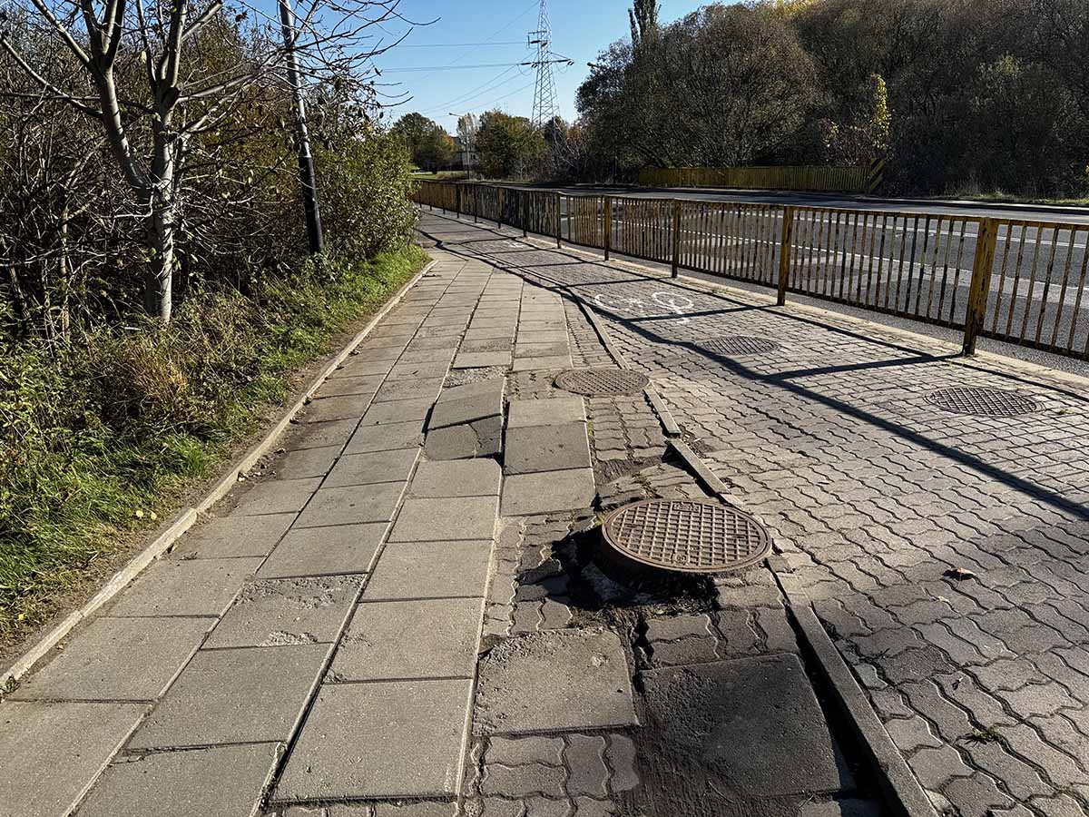 Chodnik wzdłuż ulicy jest w opłakanym stanie – płyty chodnikowe są nierówne, popękane i zapadnięte. Idąc tamtędy, można naprawdę wybić sobie zęby albo skręcić nogę. Równie źle wygląda ścieżka rowerowa, której kostka jest jest nierówna.