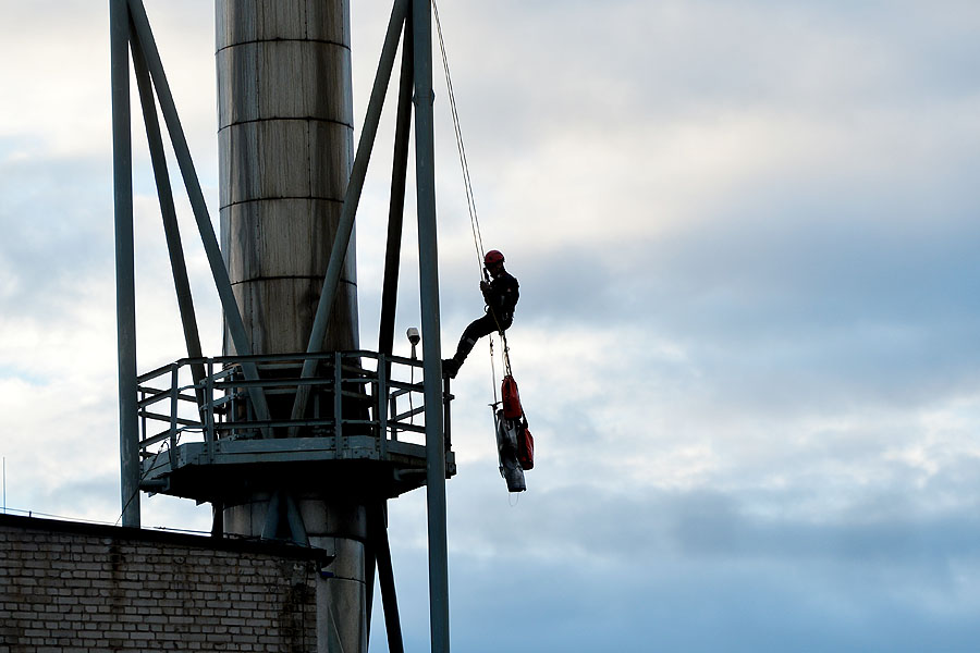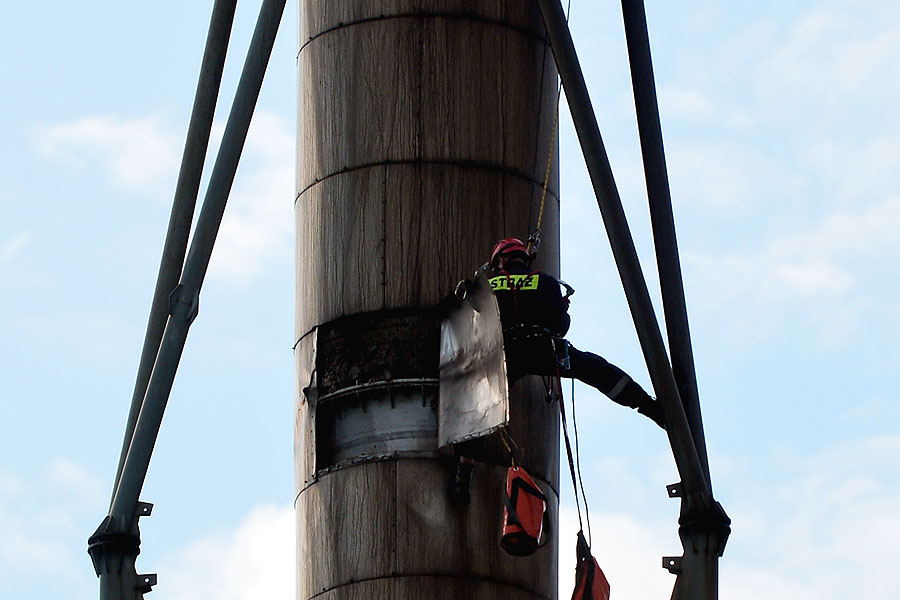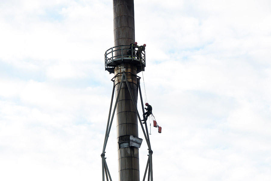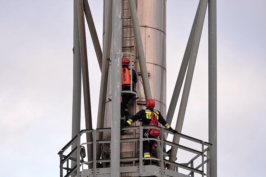 Nieskuteczna okazała się próba likwidacji zagrożenia przy pomocy drabiny mechanicznej. Wiał zbyt silny wiatr. Dlatego wezwano „wspinaczy” z Łodzi. Strażacy weszli po drabince technicznej na szczyt komina, a następnie jeden z nich opuścił się na linie i odciął fragment blachy.