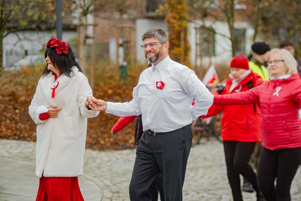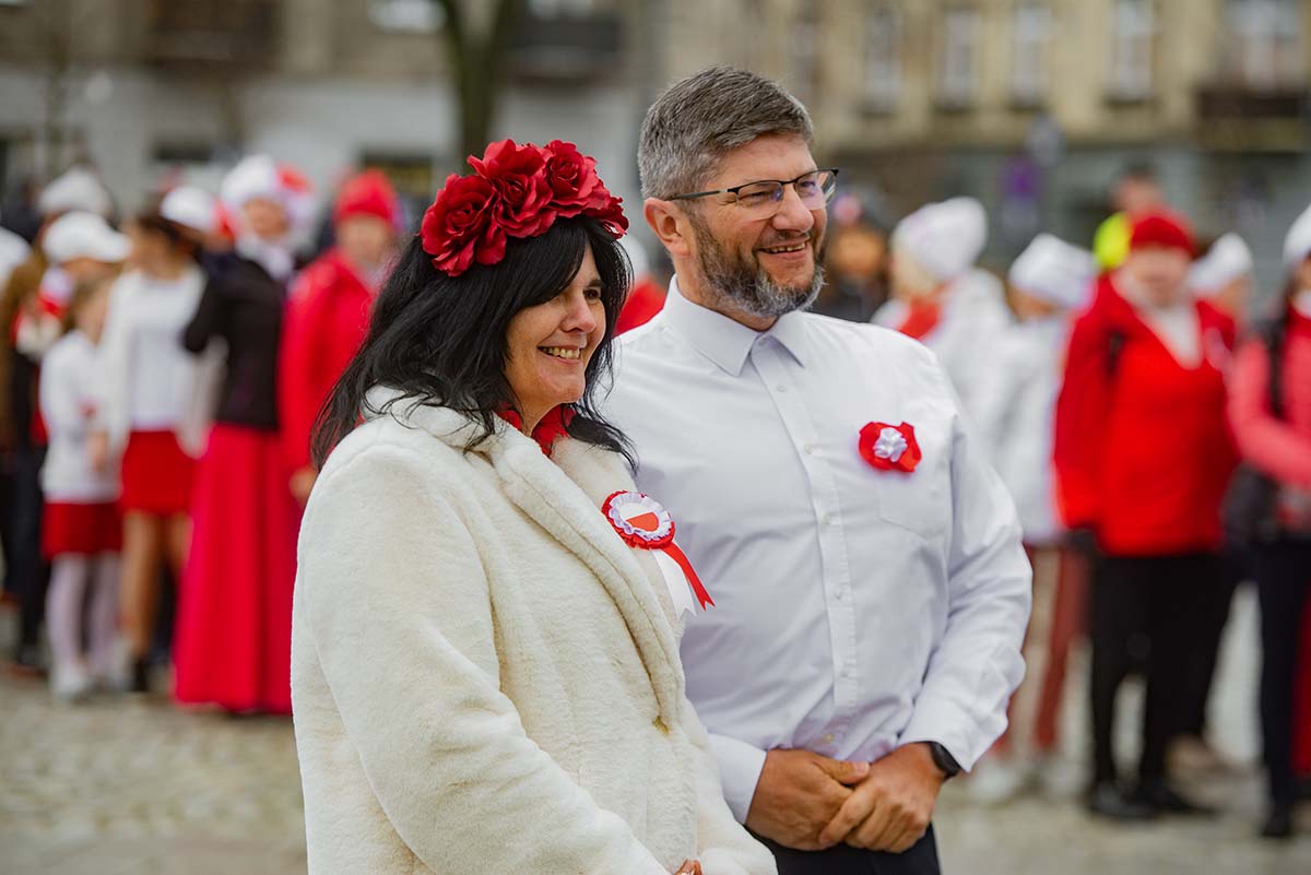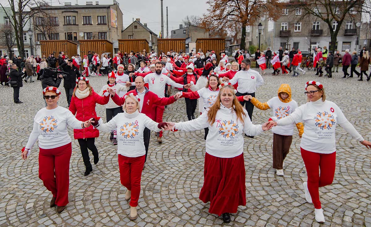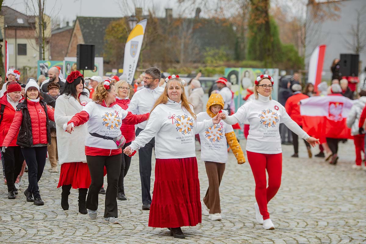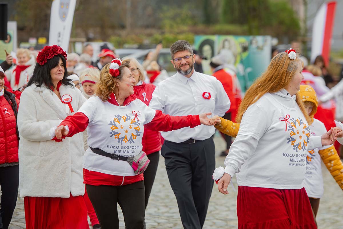 Korowód poprowadziły panie z Koła Gospodyń Miejskich, w barwnych biało-czerwonych strojach, które dodały uroku całemu wydarzeniu. W drugiej parze szedł prezydent Pabianic Grzegorz Mackiewicz wraz ze swoją zastępczynią Aleksandrą Jarmakowską-Jasiczek.