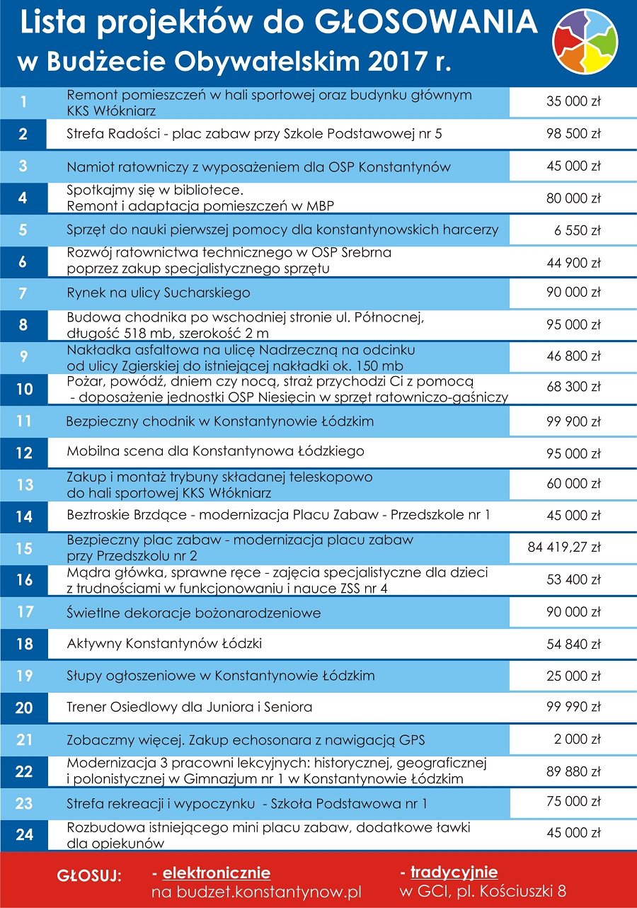 Lista zweryfikowanych zadań liczy 24 pozycje, które spełniły wymogi formalne. Wśród nich znajduje się kilka pomysłów na poprawę infrastruktury miejskiej – nakładki asfaltowe na drogi i nowe chodniki, obecne są także remonty szkolnych pracowni i budowa placów zabaw przy podstawówkach. Wśród mniej przyziemnych propozycji pojawiła się propozycja zakupu mobilnej sceny czy echosonara z nawigacją GPS. Pełną listę projektów, z których będą wybierać mieszkańcy Konstantynowa publikujemy poniżej.