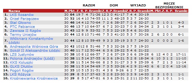 Liga w ogóle była niezwykle wyrównana 3. Stal Głowno i 13. GLKS Dłutów dzieli na koniec sezonu bowiem tylko 8 oczek. Pierwsze miejsce z 64 punktami zajął LKS Rosanów.