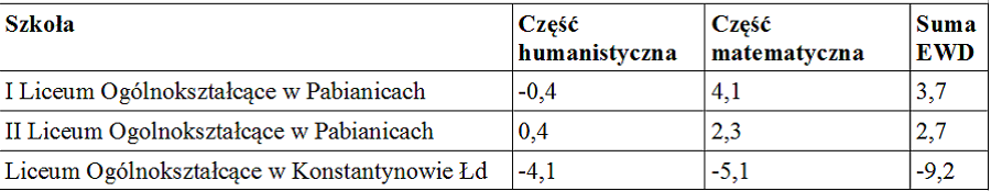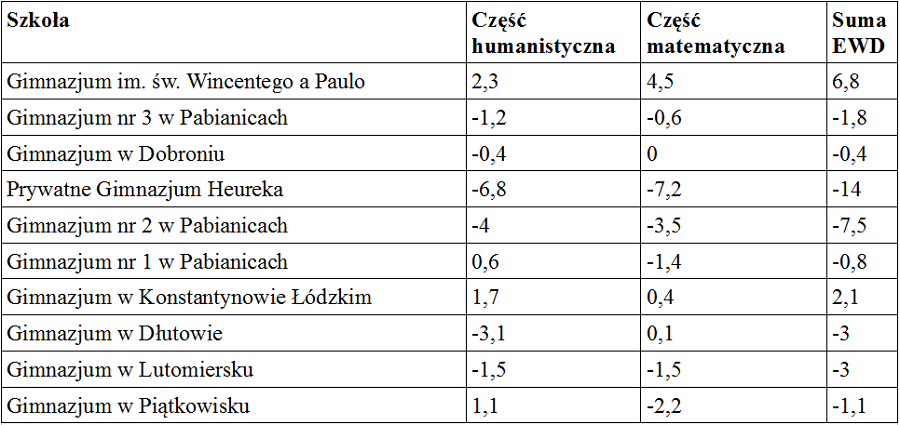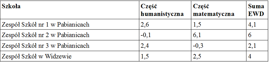 Bardziej dociekliwi odnajdą również tabele, w których możemy sprawdzić jak poprawiły się lub pogorszyły wyniki konkretnych szkół w wybranym dwuletnim okresie czasu. Poniżej publikujemy sumy edukacyjnej wartości dodanej dla wszystkich szkół w powiecie pabianickim, dla których system posiada właściwe dane. Wyniki te pochodzą z przedziału lat 2014-2016.
