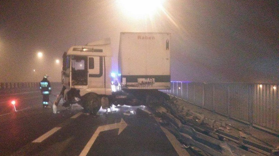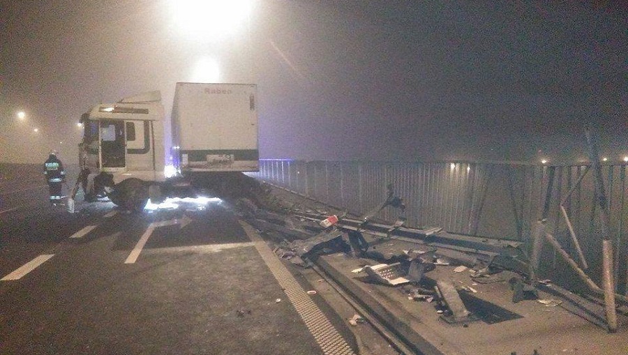Strażacy zostali wysłani na miejsce zdarzenia po godz. 2.00 nad ranem. Zastęp z Pabianic oraz druhowie z OSP Dobroń pracowali nad usunięciem skutków wypadku ciężarówki. Z powodu złych warunków pogodowych pojazd wpadł w poślizg, obrócił się o 180 stopni i uszkodził bariery energochłonne trasy. Z baku zaczęło wyciekać paliwo, dlatego strażacy zneutralizowali wyciek pianą ciężką. Kierowca wyszedł ze zdarzenia cały i zdrowy. Akcja strażaków trwała ok. godziny.
