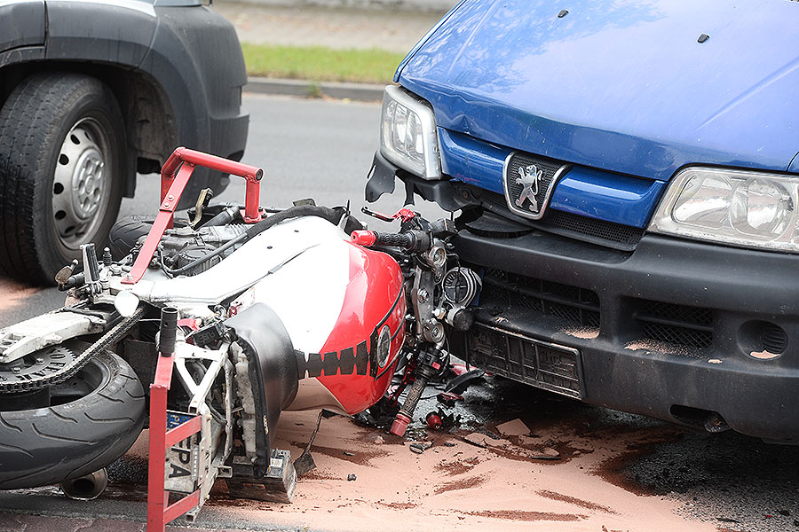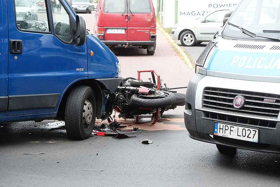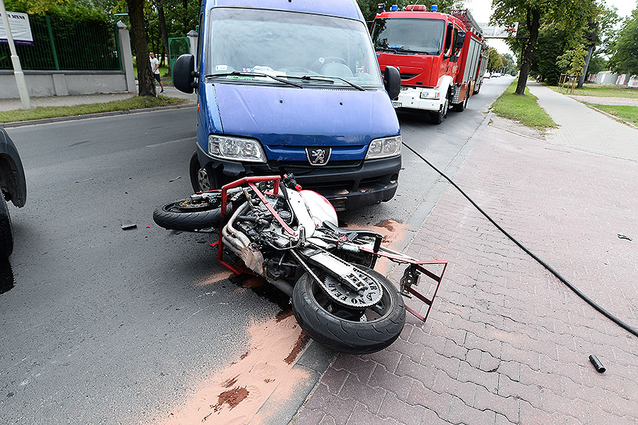 Około godz. 15.20 26-latek jechał ul. Grota Roweckiego w stronę pływalni. Na wysokości wjazdu na pole golfowe drogę zajechał mu kierowca Peugeota. Chciał skręcić w lewo, ale uderzył prosto w motocykl. Poszkodowany Damian D. ma uraz ręki, ale jego stan nie wymagał hospitalizacji. Na Grota Roweckiego tworzą się korki.