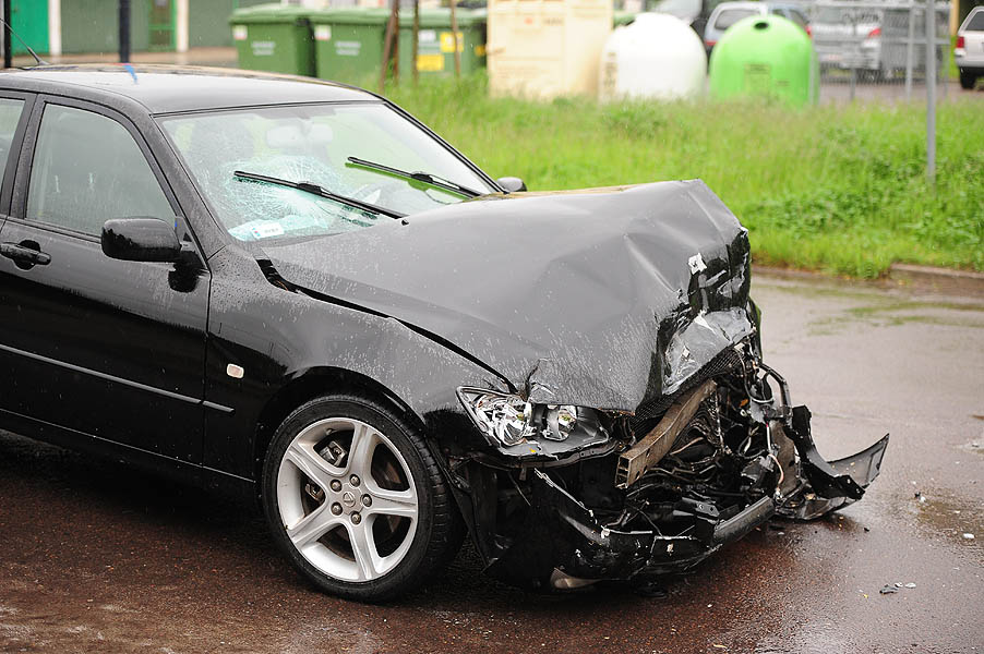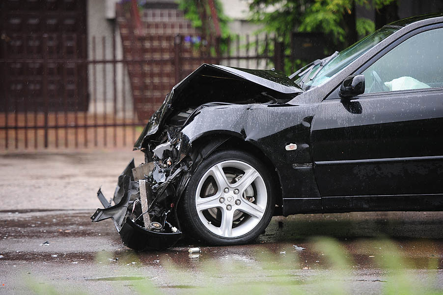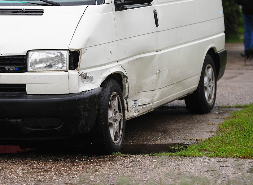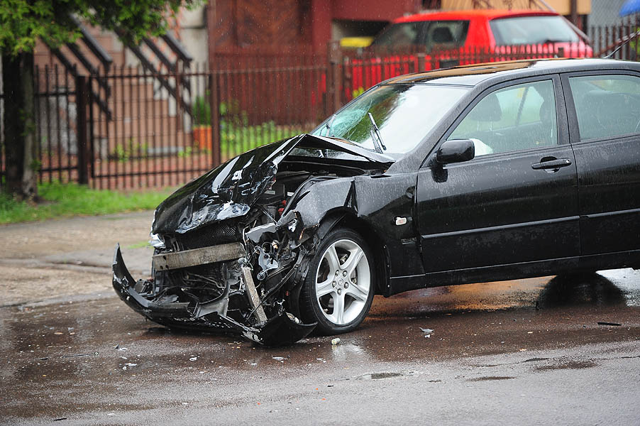 Dziś około południa czarny Lexus pędził ul. Bugaj od Grota Roweckiego. Na łuku drogi przy sklepie Żabka, rozpoczął wyprzedzanie ciężarówki. Nie opanował szybkiego auta i wpadł w poślizg. Odbił się od krawężnika i zjechał na przeciwległy pas ruchu. Uderzył w jadącego Transportera.