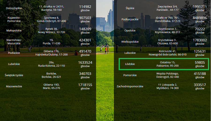 Ten plebiscyt przebiegał dla nas o wiele spokojniej niż głosowanie na podwórko od Nivea, Pabianice przez zdecydowaną większość z minionych dwóch miesięcy jego trwania, znajdowały się na pierwszym miejscu, przeganiając inne miejscowości z woj. łódzkiego znaczną ilością głosów. Nasza wygrana kosztowała o wiele mniej wysiłku niż zwycięstwo np. miejscowości Paniówki z woj. śląskiego, która potrzebowała prawie 2 mln głosów.