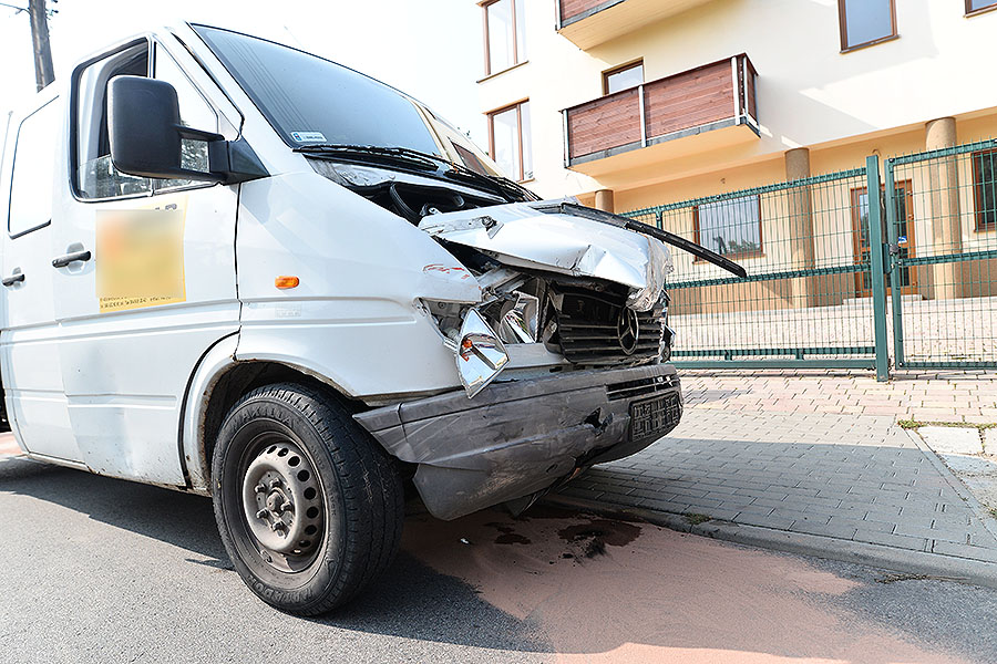 Dostawczy Mercedes wjechał w bok prawidłowo jadącego KIA. Kierowca osobówki został poszkodowany.