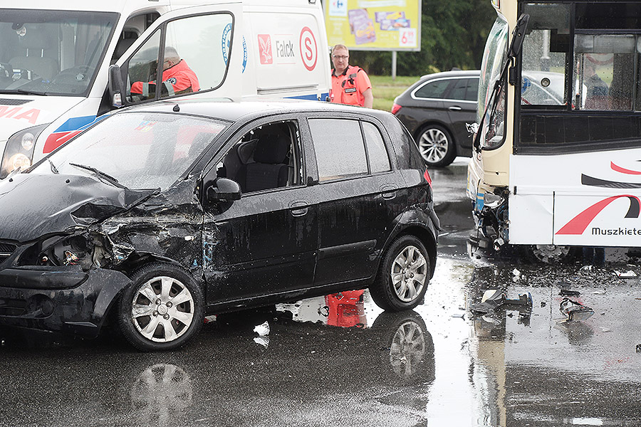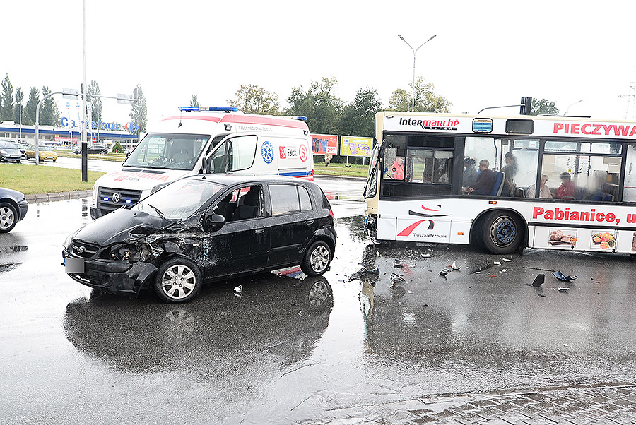 Do wypadku doszło przed godz. 14.00. Autobus linii nr 7 skręcał z ul. Nawrockiego w Waltera Jankego. Podczas manewru zderzył się z Hyundaiem na poddębickich numerach rejestracyjnych. 36-letni kierowca „osobówki” najprawdopodobniej wjechał na skrzyżowanie na czerwonym świetle. – Kobieta, która jechała za tym panem ma nagranie z kamery samochodowej i widać czerwone światło – powiedział kierowca autobusu.