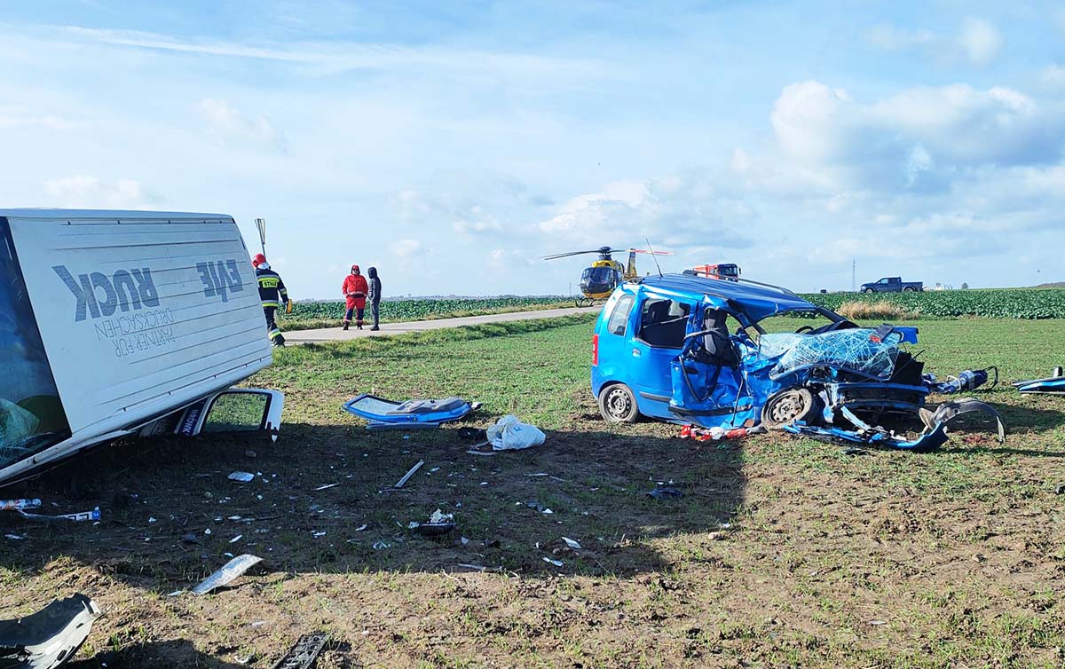 Ze wstępnych ustaleń wynika, że w wyniku zderzenia trzy osoby zostały poszkodowane, w tym jedna ciężko. Na miejsce natychmiast skierowano służby ratunkowe – dwa zastępy Państwowej Straży Pożarnej, jednostki OSP, dwa zespoły ratownictwa medycznego oraz załogę Lotniczego Pogotowia Ratunkowego.