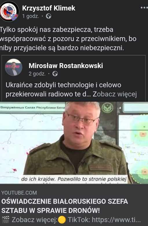Tu następny piewca Putina. Próbował się dostać do Rady Powiatu z ramienia tzw. Pabjan. Za swoje wpisy powinien.byx na zawsze usunięty z przestrzeni publicznej. A, jak widać, wyznawcy ruskich są wszędzie i mają się dobrze. Dziś tłumaczy, że Ukraina zdalnie przekierowała te ruskie drony specjalnie na Polskę. Skąd to wie?