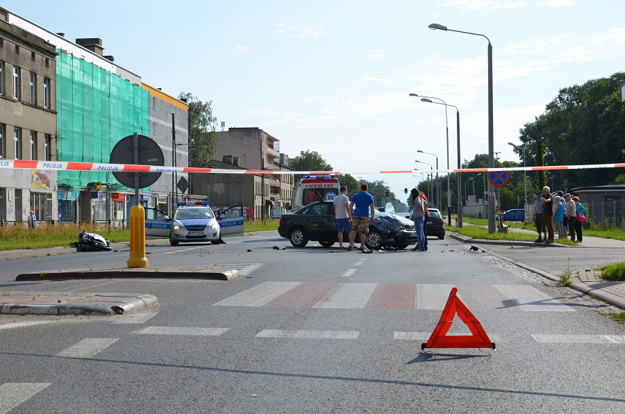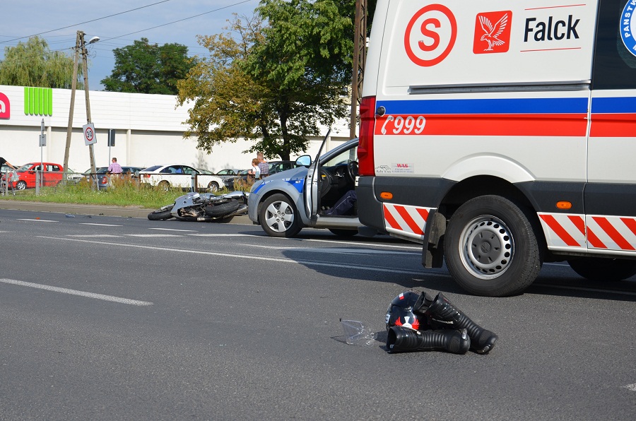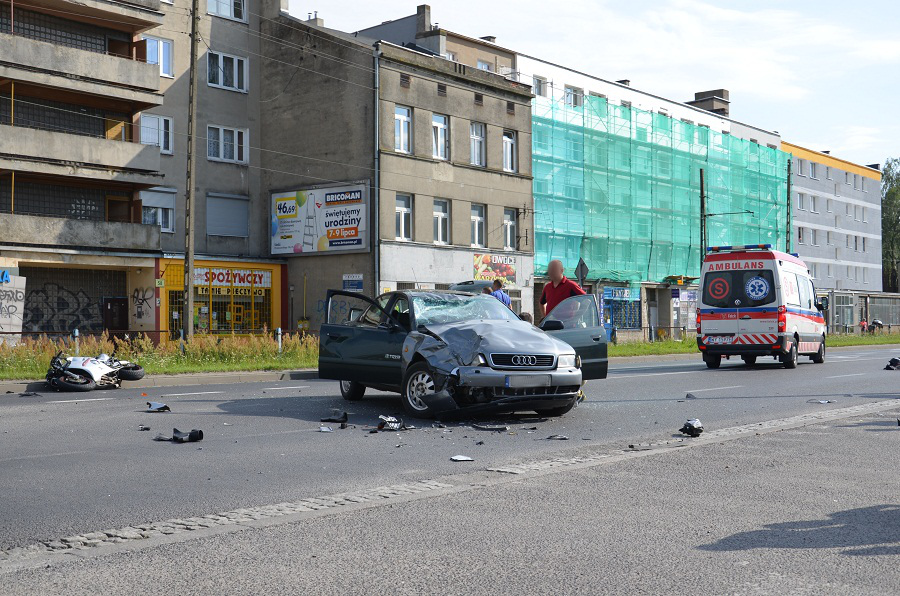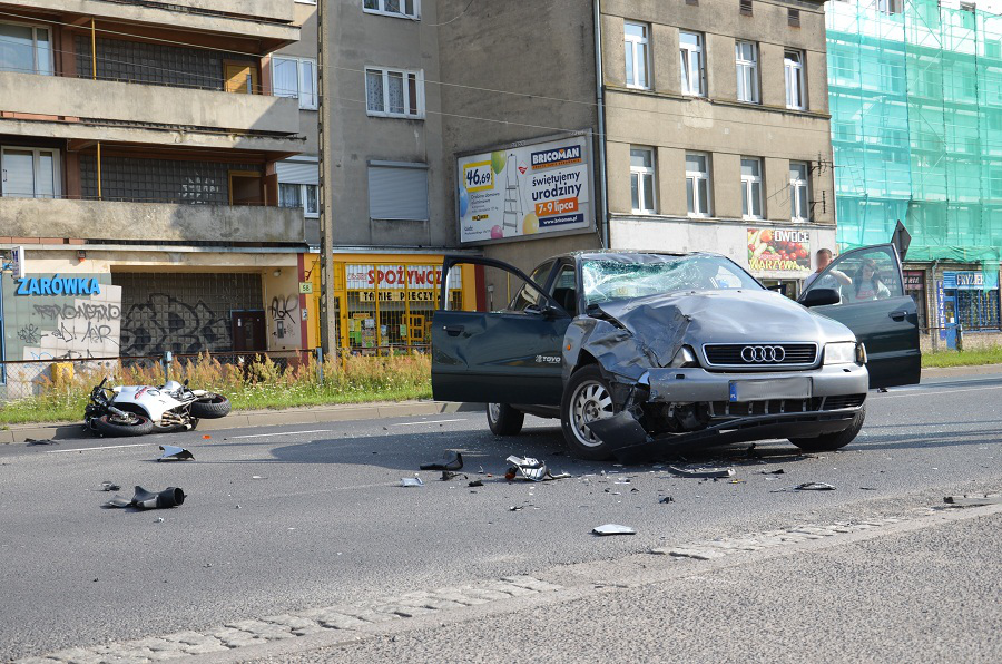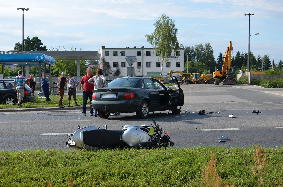 Samochód Audi jechał od strony Łasku. Chciał skręcić w lewo na parking przy myjni i dyskoncie spożywczym. Nie zauważył jadącego z naprzeciwka motocyklisty i zajechał mu drogę. Kierujący jednośladem nie miał szans na uniknięcie kolizji. Wbił się w prawy bok samochodu na łaskich numerach rejestracyjnych.