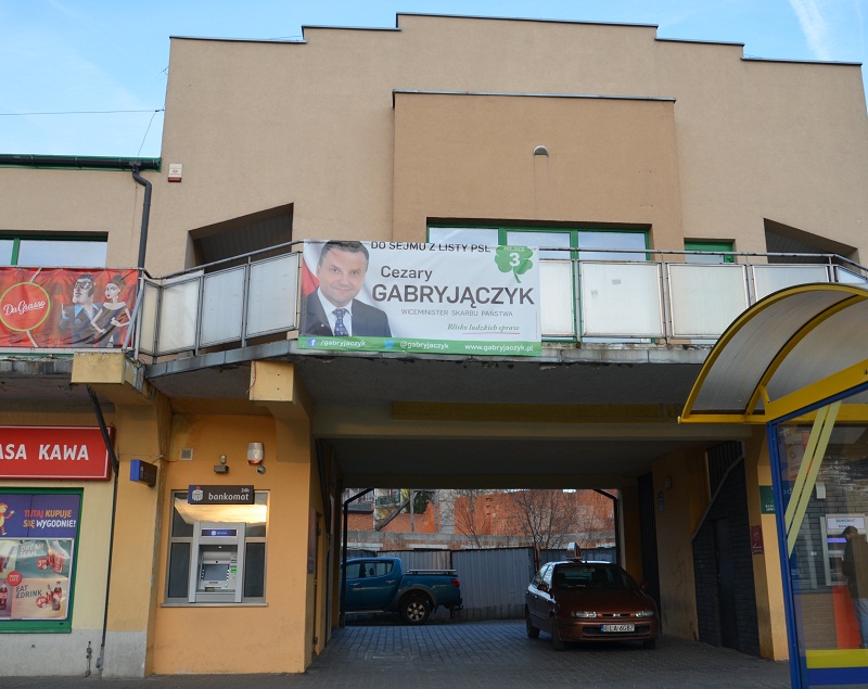 Kandydat na posła (z list PSL) Cezary Gabryjączyk również nie sprzątnął swojego banera. Ten jest powieszony na piętrze pawilonu handlowego przy ul. 20 stycznia 60.