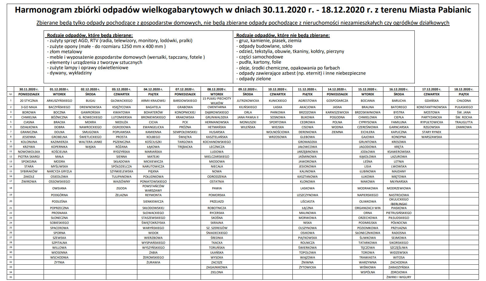 Musimy je wystawić do godz. 7.00 w dniu wyznaczonym dla danej ulicy (według podanego harmonogramu). Eko-Region odbierze: zużyty sprzęt AGD i RTV (radia, telewizory, monitory, lodówki, pralki), domowy sprzęt sanitarny, małe zużyte opony, metalowy złom, zużyte lampy i oprawy oświetleniowe, meble i elementy wyposażenia, baterie i akumulatory, elementy stolarki mieszkaniowej i gospodarczej, elementy i urządzenia z tworzyw sztucznych. Nie będą odbierane: gruz, kamienie, piasek, ziemia, oleje i środki chemiczne, lekarstwa, odpady budowlane, odzież, tekstylia, obuwie, tkaniny wystroju wnętrz, kołdry, pierzyny, szkło, opakowania po farbach i lakierach, odpady pochodzące z warsztatów rzemieślniczych, odpady zawierające azbest i inne niebezpieczne, odpady zielone. Więcej informacji można uzyskać w spółce Eko-Region tel. (42) 215-51-41 lub Wydziale Ochrony Środowiska Urzędu Miejskiego tel. (42) 22-54-628, (42) 22-54-629.