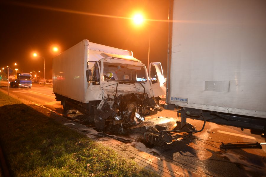 Przy Polo Markecie na ulicy Łaskiej około 16:45 doszło do zderzenia dwóch ciężarówek. Strażacy kilkanaście minut wyciągali kierowcę ze zmiażdżonej kabiny.