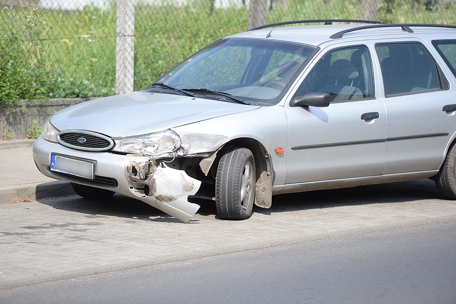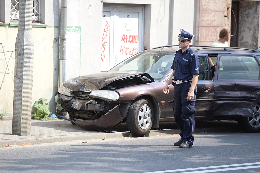 Srebrny Ford Mondeo jechał od ul. Zamkowej. Kierowca chciał skręcić w św. Rocha, ale nie dostrzegł jadącego od ul. Partyzanckiej brązowego Forda. Auta zderzył się na skrzyżowaniu, ale ciemniejszy pojazd zatrzymał się dopiero na ścianie kina Mazur. Lekarz zbadał kobietę ze srebrnego Forda, ale nie wymagała hospitalizacji. Na miejsce wezwano pogotowie energetyczne, bo uszkodzona została skrzynka wisząca na ścianie kina.