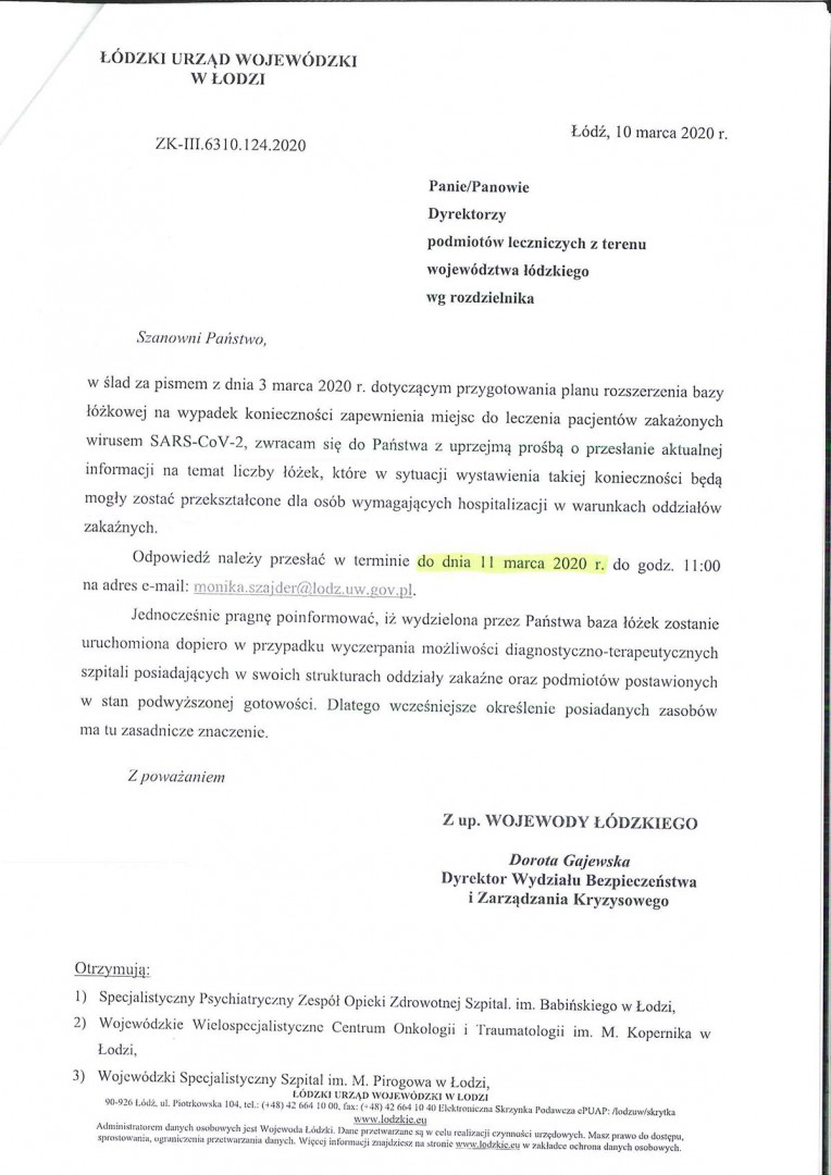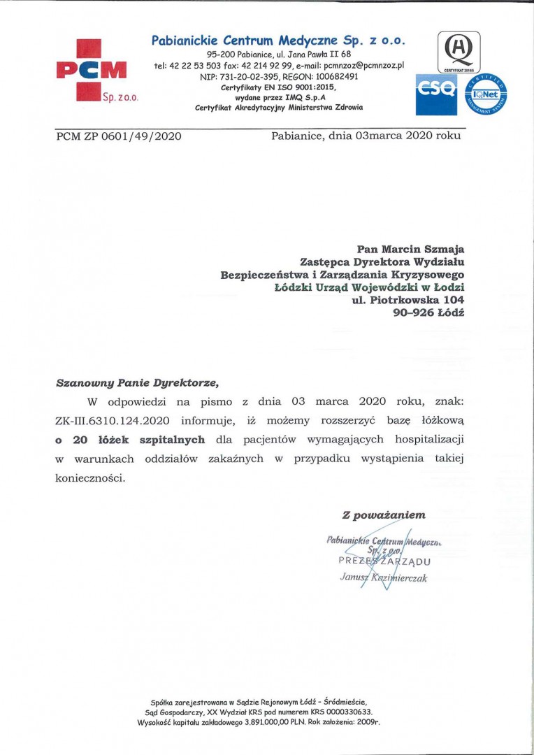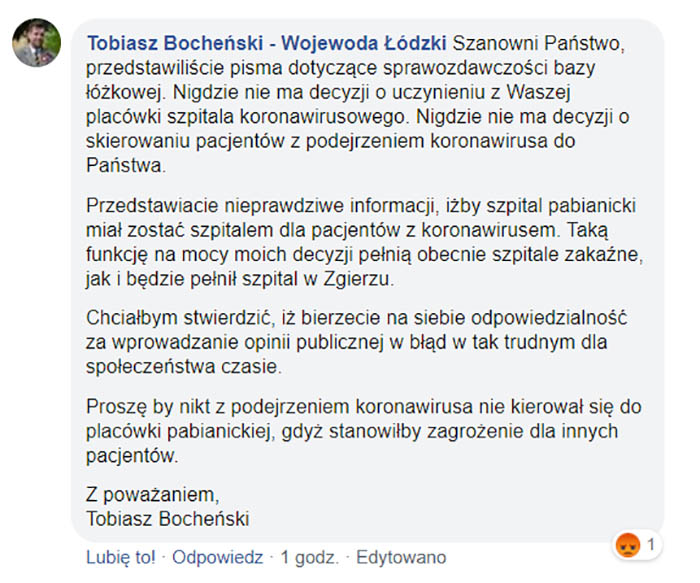 Na na końcu oświadczenia jest link do naszego tekstu „Potrzebne respiratory, kardiomonitory, karetka, a nawet łóżka„. Opisaliśmy sytuację dotyczącą ewentualnego utworzenia u nas w Pabianickim Centrum Medycznym oddziału zakaźnego na 20 łóżek. Od rzecznika prezydenta Pabianic otrzymaliśmy w piątek informację, że w „sytuacji podwyższonej konieczności Pabianickie Centrum Medyczne decyzją wojewody będzie musiało zorganizować oddział zakaźny na 20 łóżek.”