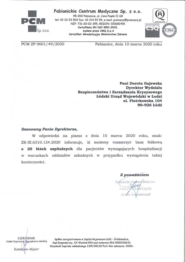 Z olbrzymim zaskoczeniem oraz zdziwieniem przyjęliśmy dzisiejsze (14 marca 2020 roku) oświadczenie Wojewody Łódzkiego, które zarzuca nam Pabianickiemu Centrum Medycznemu samowolne działanie w celu zabezpieczenia miejsc dla pacjentów zarażonych koronawirusem.