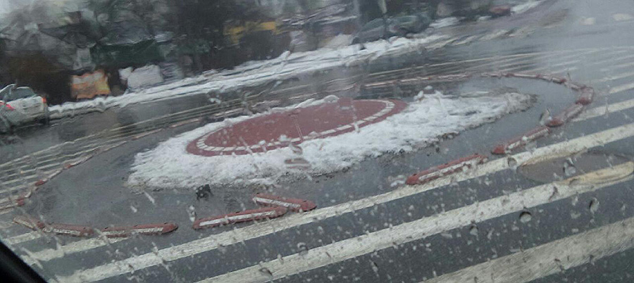 Na zaśnieżone rondo wjeżdżały ciężkie samochody, które wyrwały elementy mizernej konstrukcji. To nie pierwszy raz kiedy separatory zostały wyrwane z asfaltu. Na jednej z ostatnich sesji rady powiatowej, starosta jako zarządca drogi zapowiedział, że zleci tam zamontowanie elementów z żelbetu.