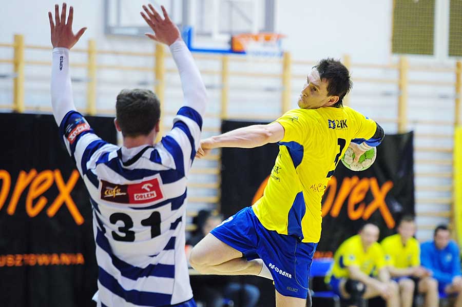 Od tej pory wynik cały czas kręcił się koło remisu. W 22. min było po 10, a 24. min osiągnęliśmy największą przewagę prowadząc 12:10. Po tym jak na 11:10 trafił Stawicki, rywale po kontrze rzucili nad bramką, a my wyprowadziliśmy akcję zakończoną celnym rzutem Przemysława Borsuka. Ostatecznie jednak pierwsze pół godziny gry zakończyło się remisem po 14, choć płocczanie mogli nawet prowadzić bo Mateusz Niemiec tuż przed syreną końcową trafił z rzutu karnego w słupek.