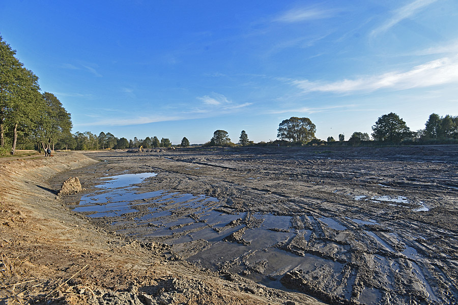 Koparki wybierające namuł z dna zbiorników pracują już tylko na drugim stawie. Nie można wejść na mostek.